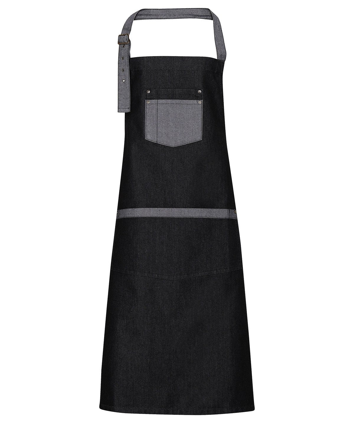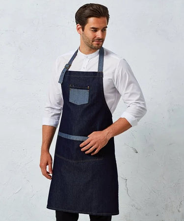 A quirky addition to the denim range, this bib apron gives an 'industrial-chic' feel to service with large gun metal eyelets securing the ties in place. The shade on the underside forms the contrast trim detail on the pocket and ties for a great reversible effect.