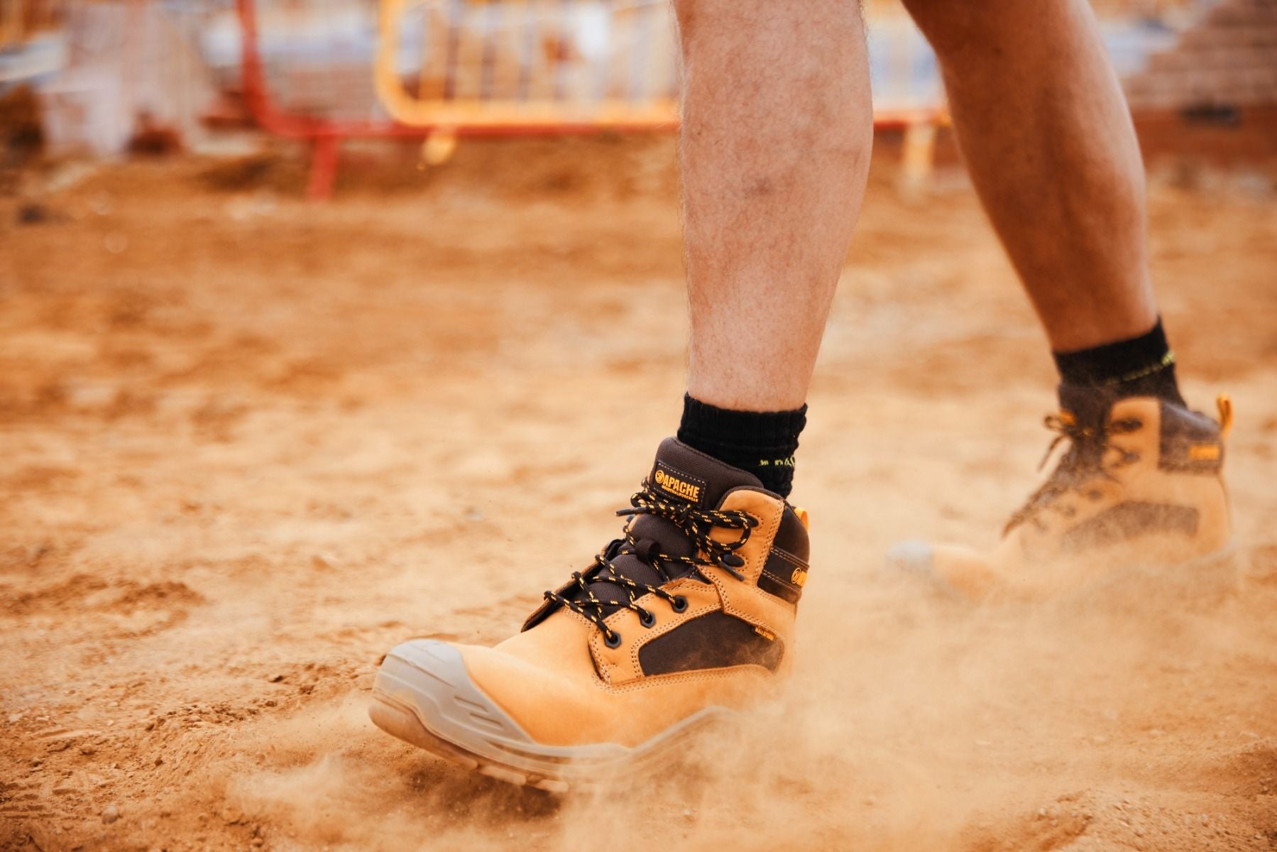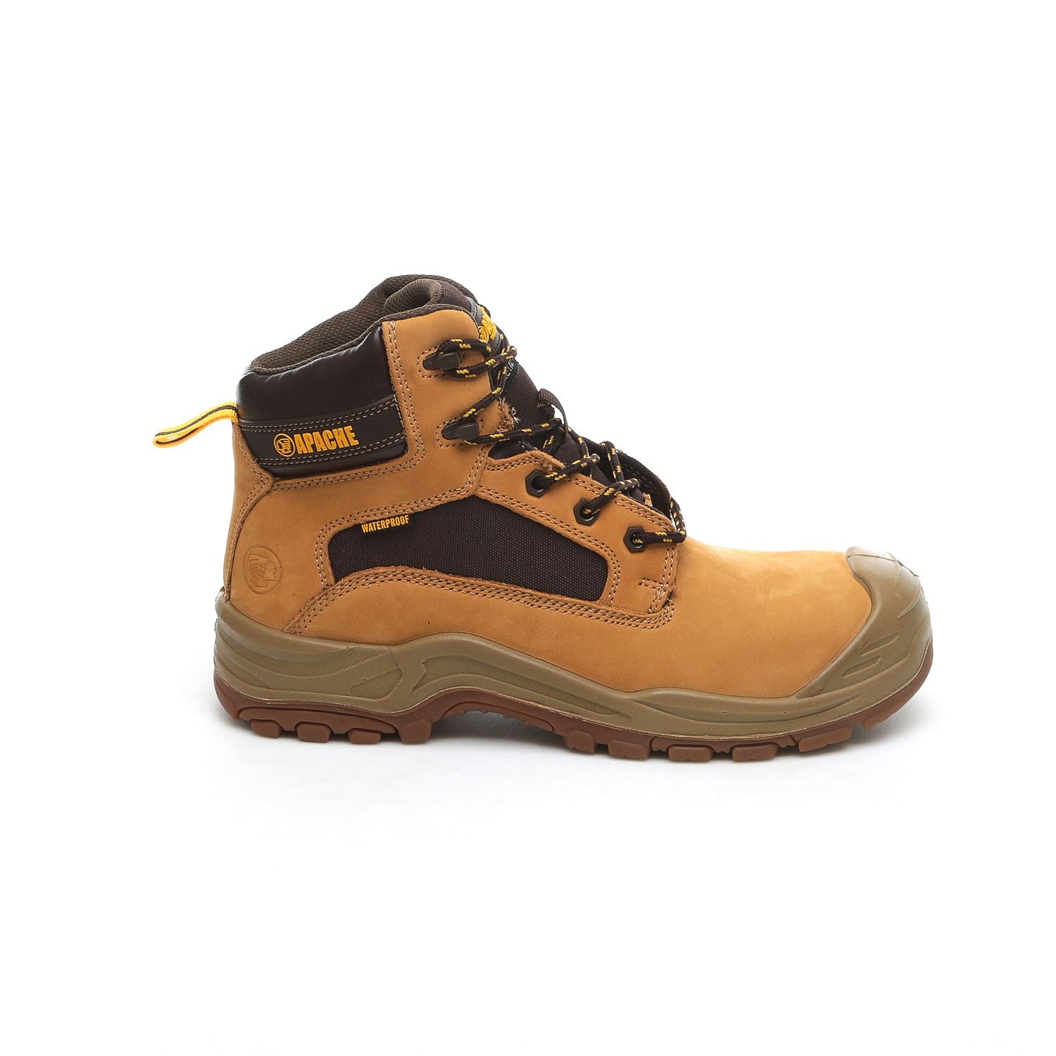 Apache Arizona work boot - Honey nubuck leather and mesh upper. Non-metallic toe cap and midsole protection. Waterproof and breathable inner lining. Anti-scuff toe protection. Heat resistant to 300 degrees C. Dual-density PU/Rubber outsole. 100% non-metallic. PU comfort insole. A tough boot for a harsh working environment.