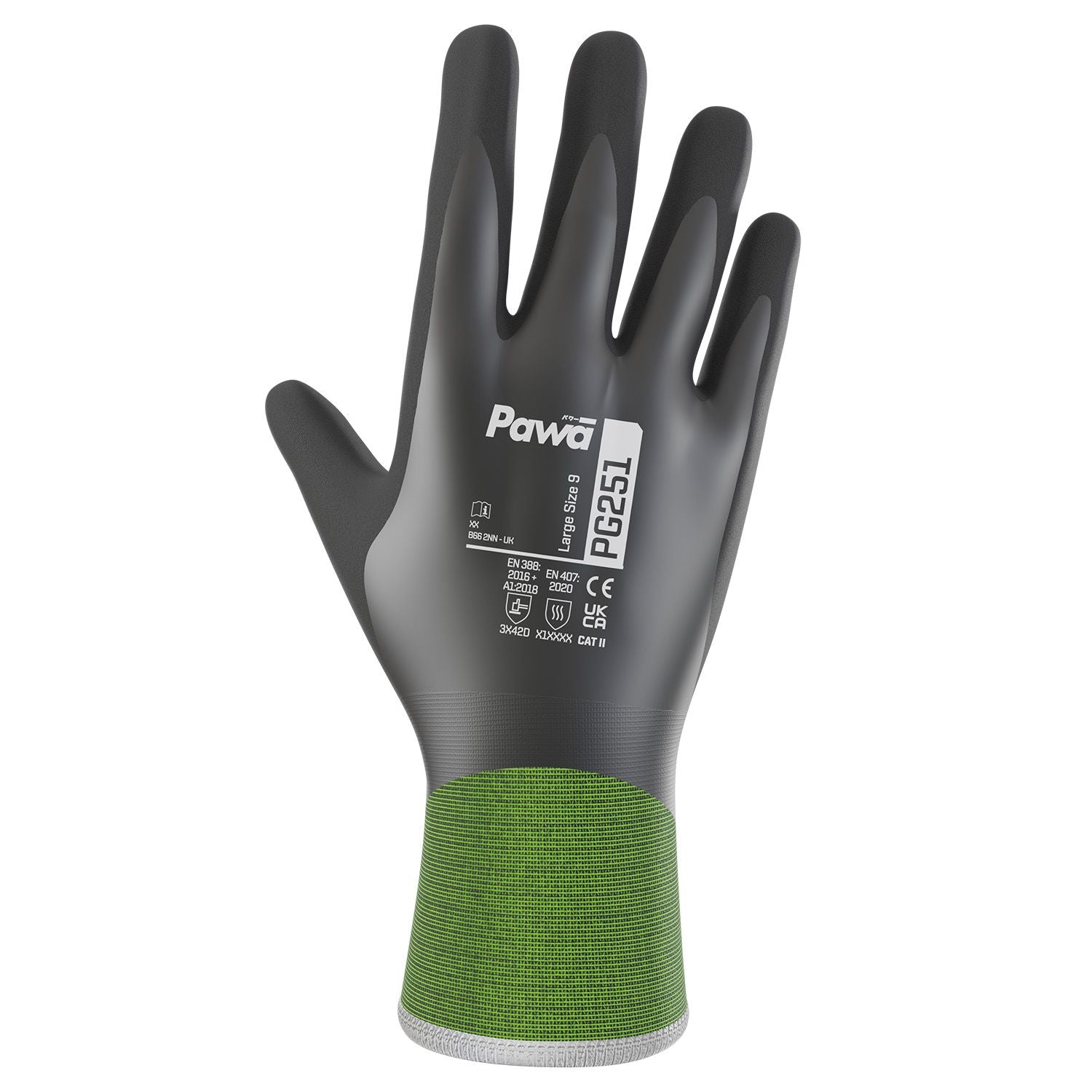The PG251 glove offers the ultimate protection in wet conditions. Featuring PawaDRY� technology over a 15 gauge, Level D cut-resistant nylon/spandex liner, these gloves will perform in the toughest conditions day after day. The high-quality latex coating and micro foam grip provide superior performance in wet conditions than nitrile. With contact heat level 1 protection also, this glove is a real all-rounder.