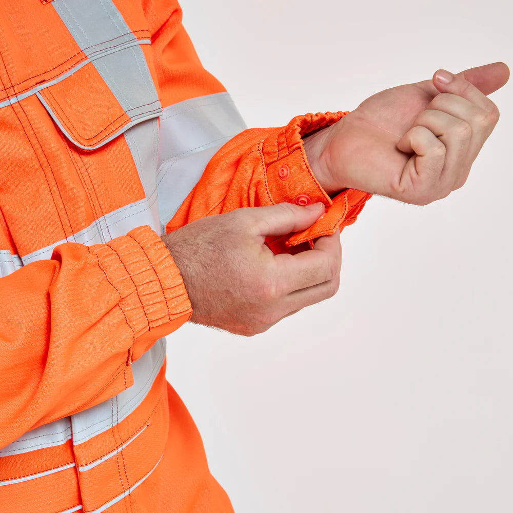 - Two 50mm sewn-on reflective tape bands at body, sleeve and lower leg