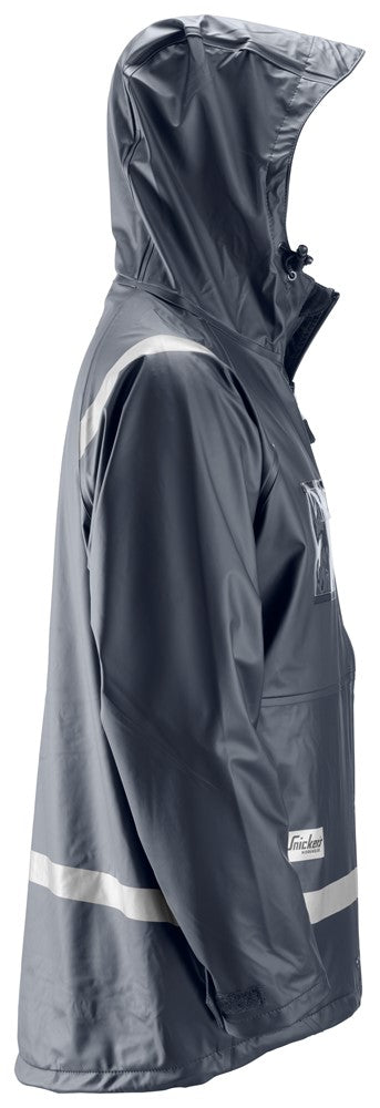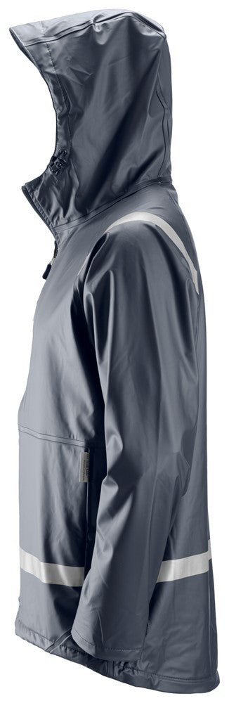 Beat the rain. For a 100% dry working day, wear this completely waterproof, PU-coated rain jacket with welded seams. Made of smooth and stretchy fabric for superior comfort. Conforms to EN 343.